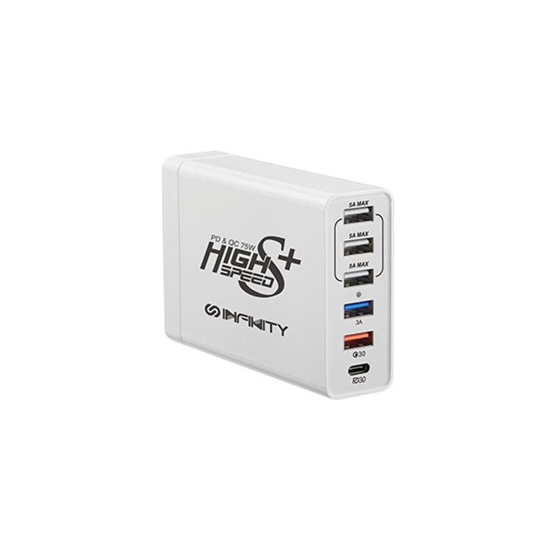 【輸入】AC 100-240V 50 / 60 Hz【總輸出】75W【輸出1-3 USB Type-A】DC5V-5A(智能分配)【輸出4 USB Type-A】DC5V-3A【輸出5 USB Type-A】支援QC3.0 (18W Max) DC5V-3A/ DC9V-2A//DC12V-1.5A【輸出6 USB Type-C】支援PD3.0 (18W Max) DC5V-3A/ DC9V-2A//DC12V-1.5A【產品大小】29.1 x 72.2 x 108mm【產品重量】258g【附送配件】電源供應線
